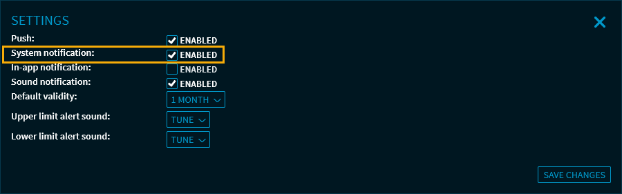 - When configuring or editing your alerts, select the "System notification" checkbox in the "Notifications" area and save the settings.