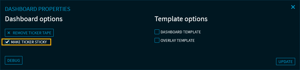 In the "Dashboard properties" dialogue window that appears, select the "Add ticker tape" checkbox.