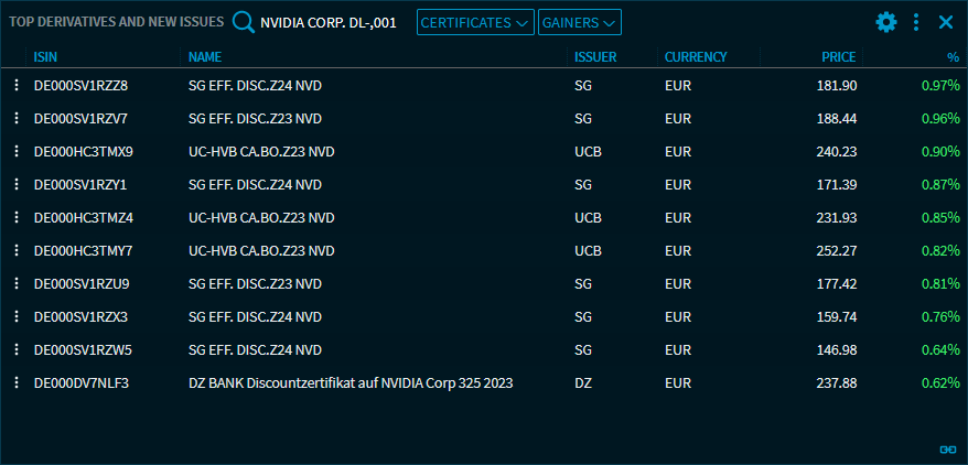In this example, you see the 10 top certificates for the underlying "DAX", sorted in descending order by the percentage change compared to the previous day's close.
