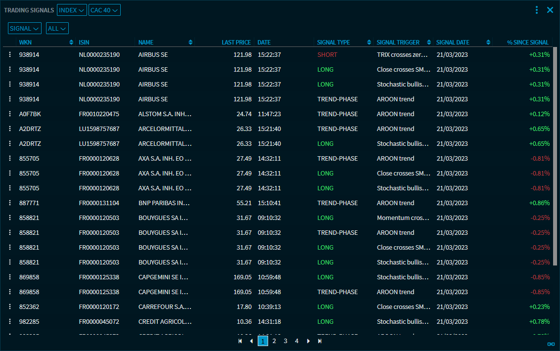 The "Trading Signals" widget displays trading signals (long/short) generated for securities from the chart analysis.