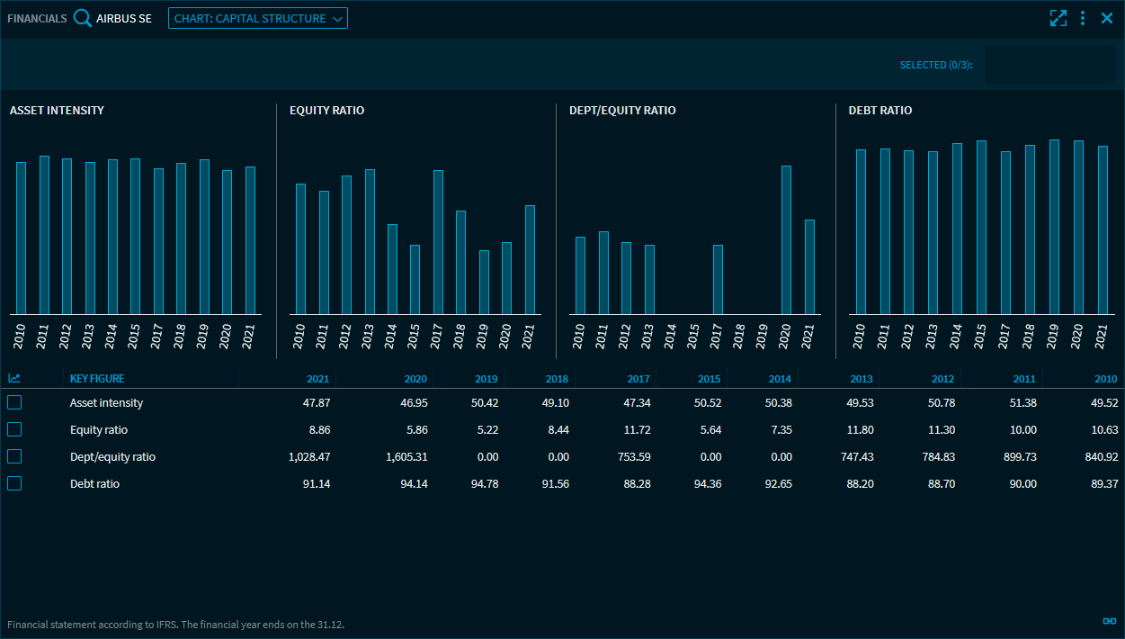Select the "Chart: Capital structure" to see the capital structure of the last 10 years. The following key figures are shown in a table as well as in a chart: