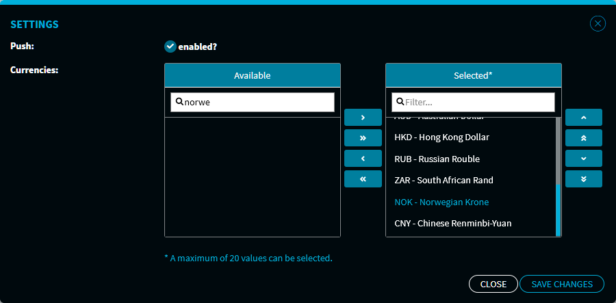 Click the "→" icon to add the selected "NOK – Norwegian Krone" to the "Selected*" box.