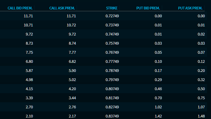 In the widget's table view, you can see the bid and ask prices for calls and puts for each strike in the currencies selected in the upper area of the General contract data section. The row with the mid-strike is slightly highlighted in colour (in the image above, the strike price is 0.90650).