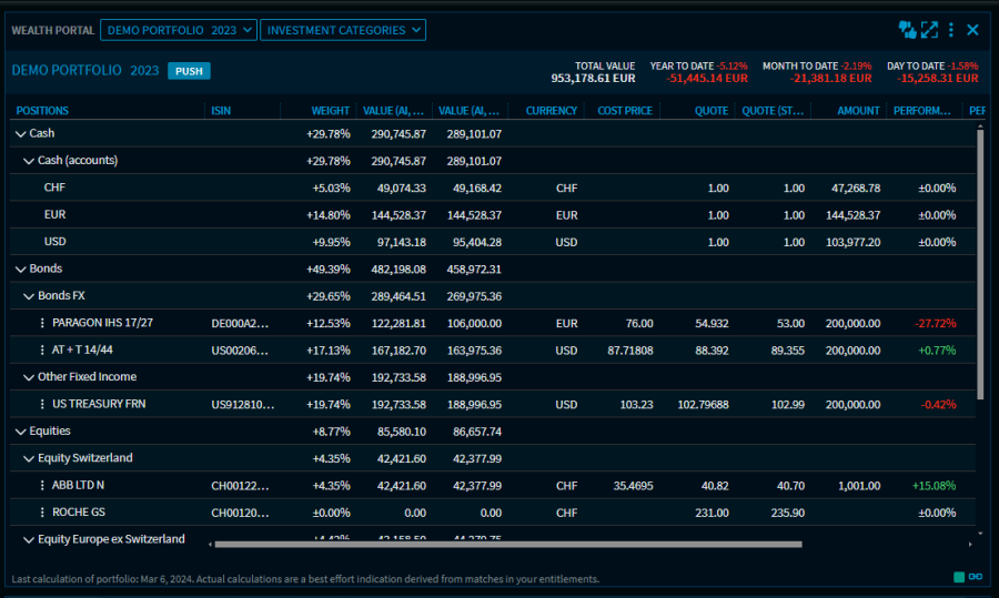 In the "Wealth Portal" widget you can switch between the “Positions” (default), “Performance (Chart)” and “Chart gallery” views via the view selection list at the top of the widget.