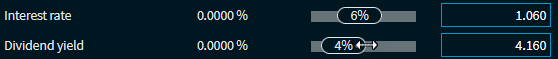 Dividend yield | Current and simulated dividend yield of the underlying. The dividend yield results from the estimated dividends per share (usually, two business years in the future), divided by the current price multiplied by 100. To change the dividend yield by using the slider, you first need to enter an initial value in the input field to the right.