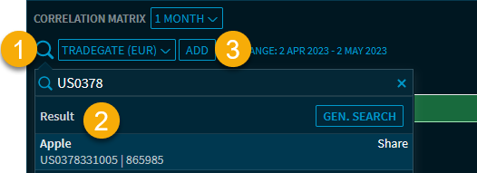 Use the integrated quick search to find a security and click the "Add" button to add the security to the matrix.