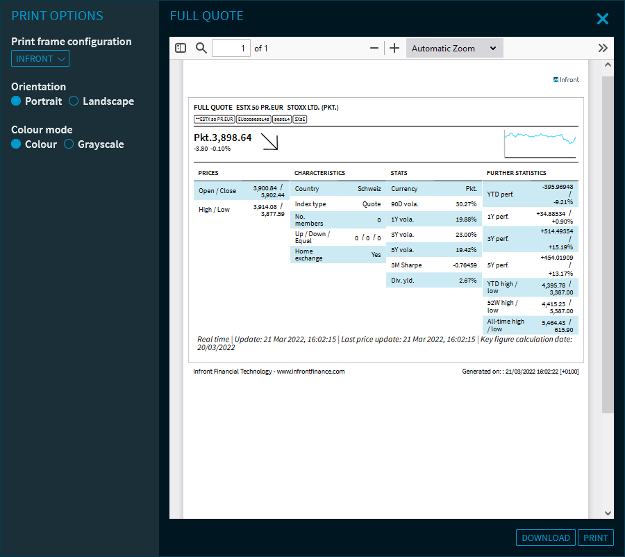 For some widgets such as the"Watchlist" or the "Fund Comparison" widget, you can select the different views for the printout here.