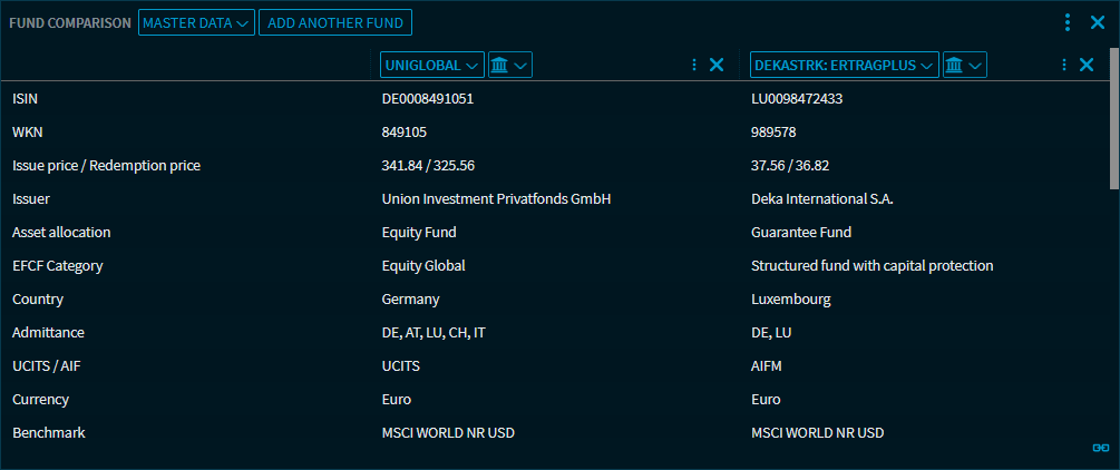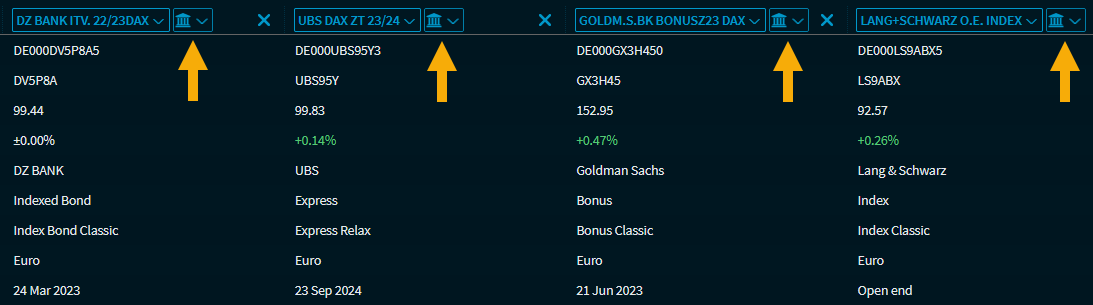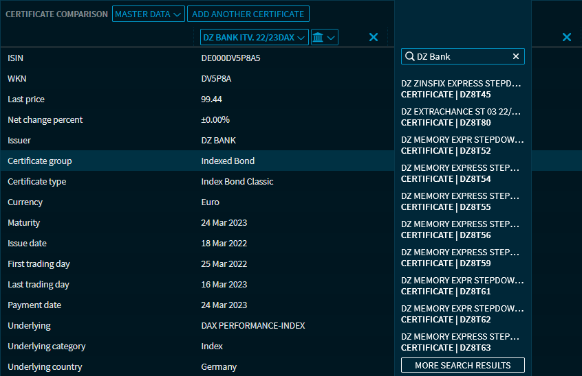 With the "Certificate Comparison" widget, you can compare up to 10 certificates. In addition to the master data, you can also find a risk and performance comparison as well as a graphical chart analysis of the certificates.