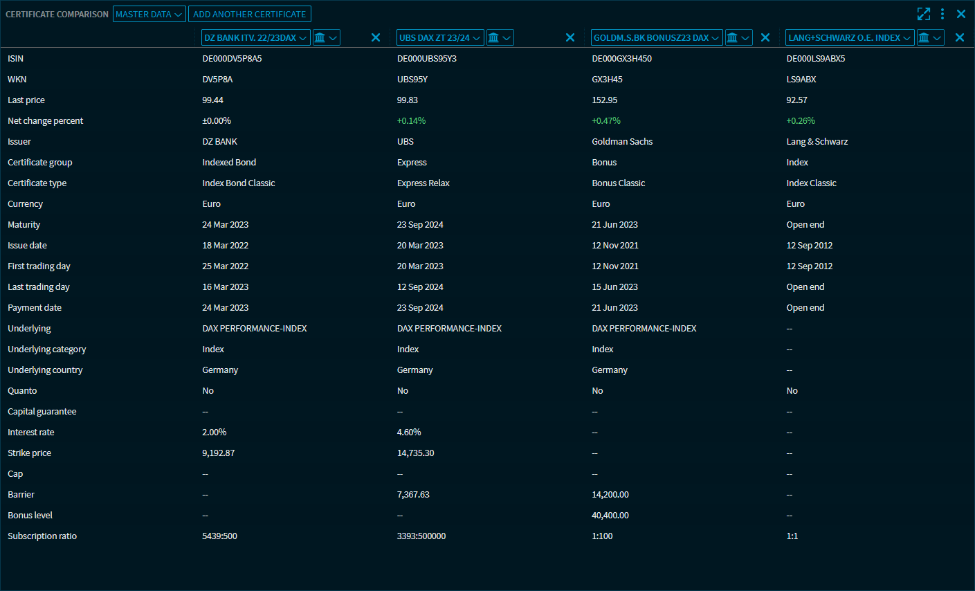 The "Master data" view allows you to compare the certificates using the following criteria: