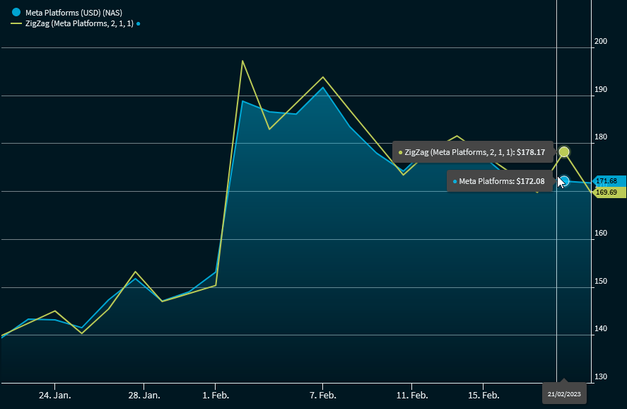 A ZigZag of "x%" only draws changes that are greater than "x%", measured from high to low or analogous from low to high, while smaller changes are ignored. It connects the reversal points with a line. The direction of the line does not change until an upward or downward trend phase corresponding to the set percentage has ended. Predictions, however, do not seem possible.