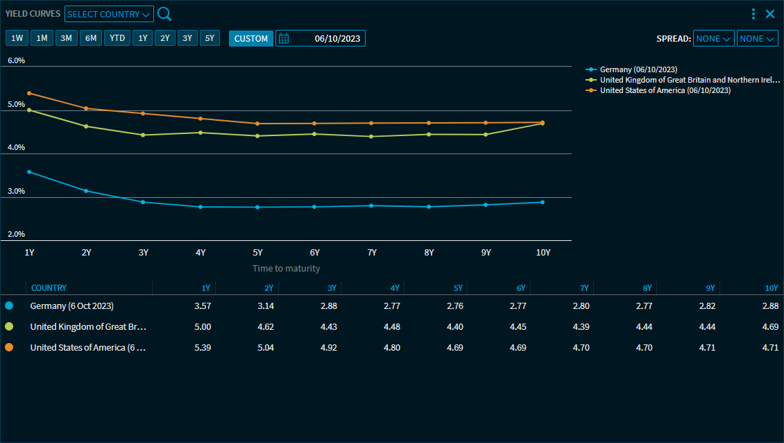 If you have marked the desired countries in the upper drop-down list “Select country”, the yield curves of the currently selected countries are displayed. You can select up to 6 different countries.